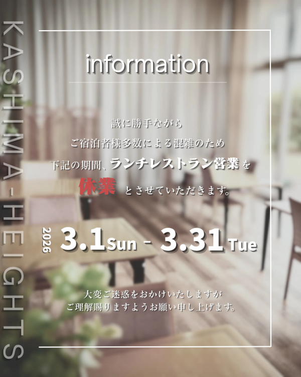 誠に勝手ながら、ご宿泊者様多数による混雑のため、3月中はランチレストラン営業を